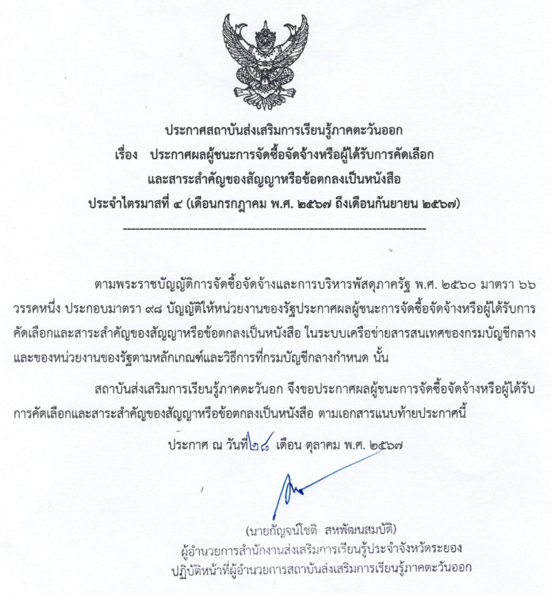 ประกาศผลผู้ชนะการจัดซื้อจัดจ้างหรือผู้ได้รับการคัดเลือกและสาระสำคัญของสัญญาหรือข้อตกลงเป็นหนังสือประจำไตรมาสที่ 4
