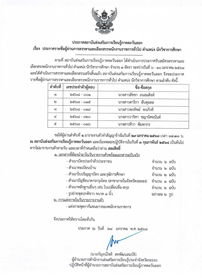 ประกาศรายชื่อผู้ผ่านการสรรหาและเลือกสรรพนักงานราชการทั่วไป ตำแหน่ง นักวิชาการศึกษา