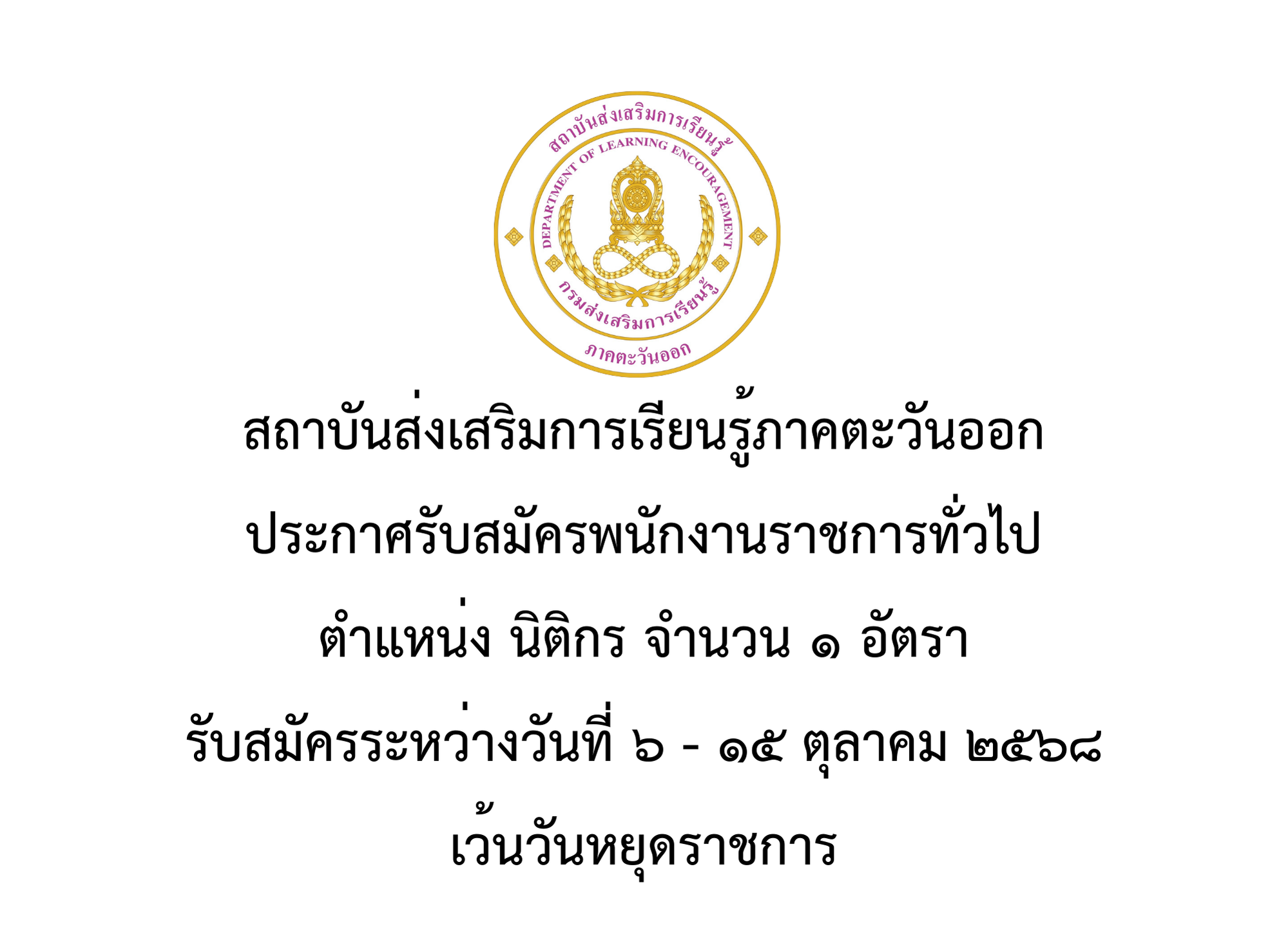 สถาบันส่งเสริมการเรียนรู้ภาคตะวันออกประกาศรับสมัครพนักงานราชการทั่วไปตำแหน่ง นิติกร จำนวน ๑ อัตรา รับสมัครระหว่างวันที่ ๖ - ๑๕ ตุลาคม ๒๕๖๘ เว้นวันหยุดราชการ